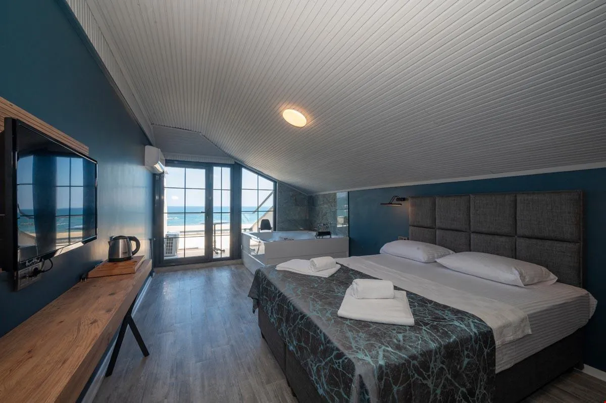 Panaromik deniz manzaralı odalarda, TV yayını, Ücretsiz kablosuz internet hizmeti.